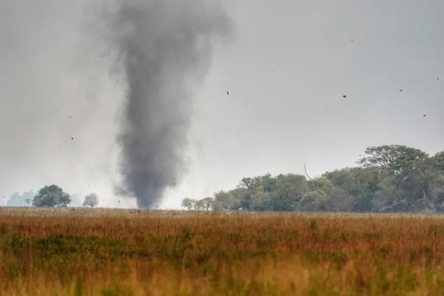 En la zona, el clima es también un enemigo. De hecho, cuando asciende la temperatura al mediodía, todo el humo y las cenizas se transforman en trombas: espirales de polvo que aparecen en el horizonte y se extienden hasta las nubes. “Es un escenario dantesco, un infierno”, dice el fotógrafo.